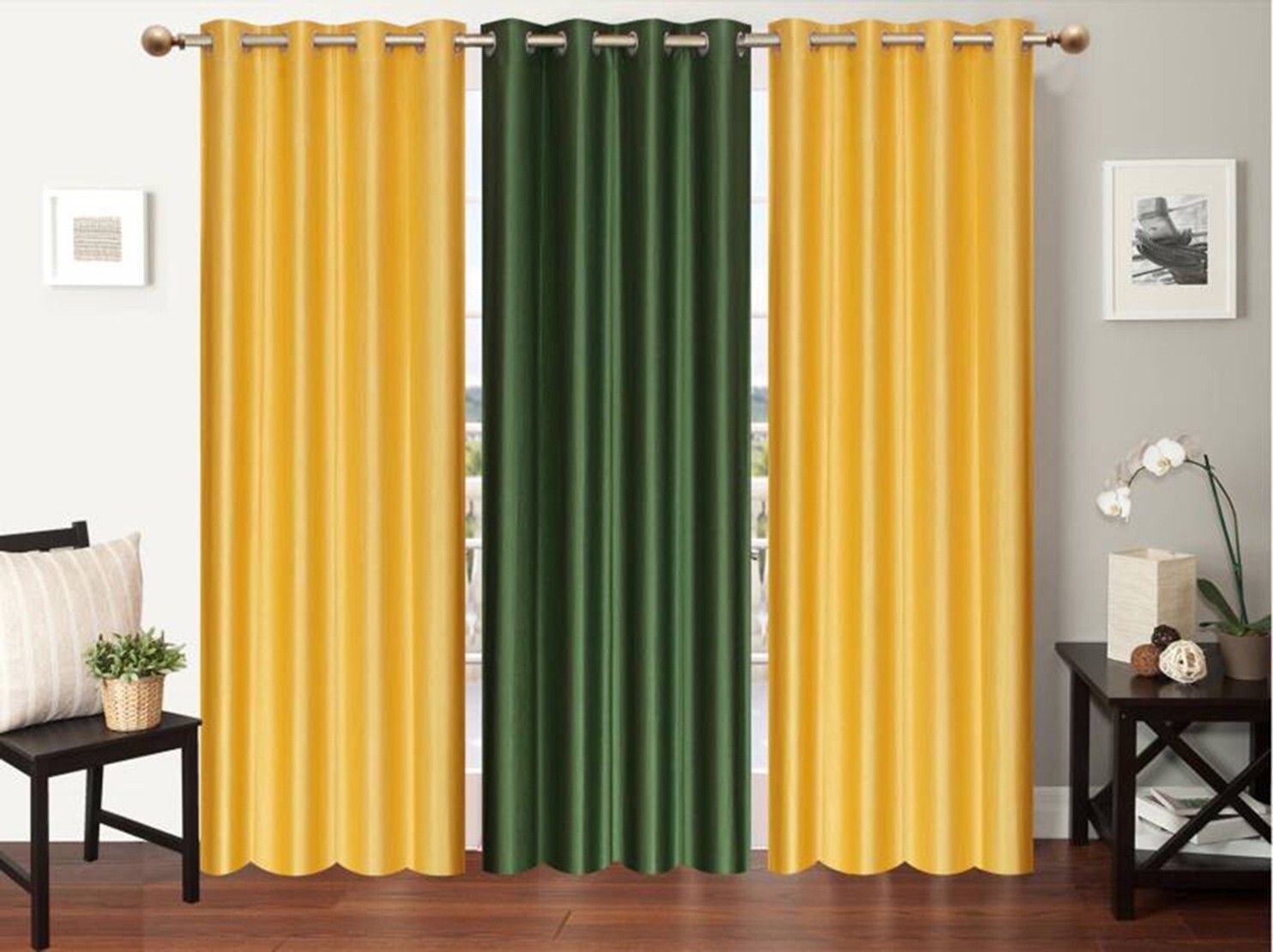 IDOLESHOP 213.5 cm (7 ft) Door Polyester Blackout Curtain Pack of 3 (Green & Yellow, Solid Design)