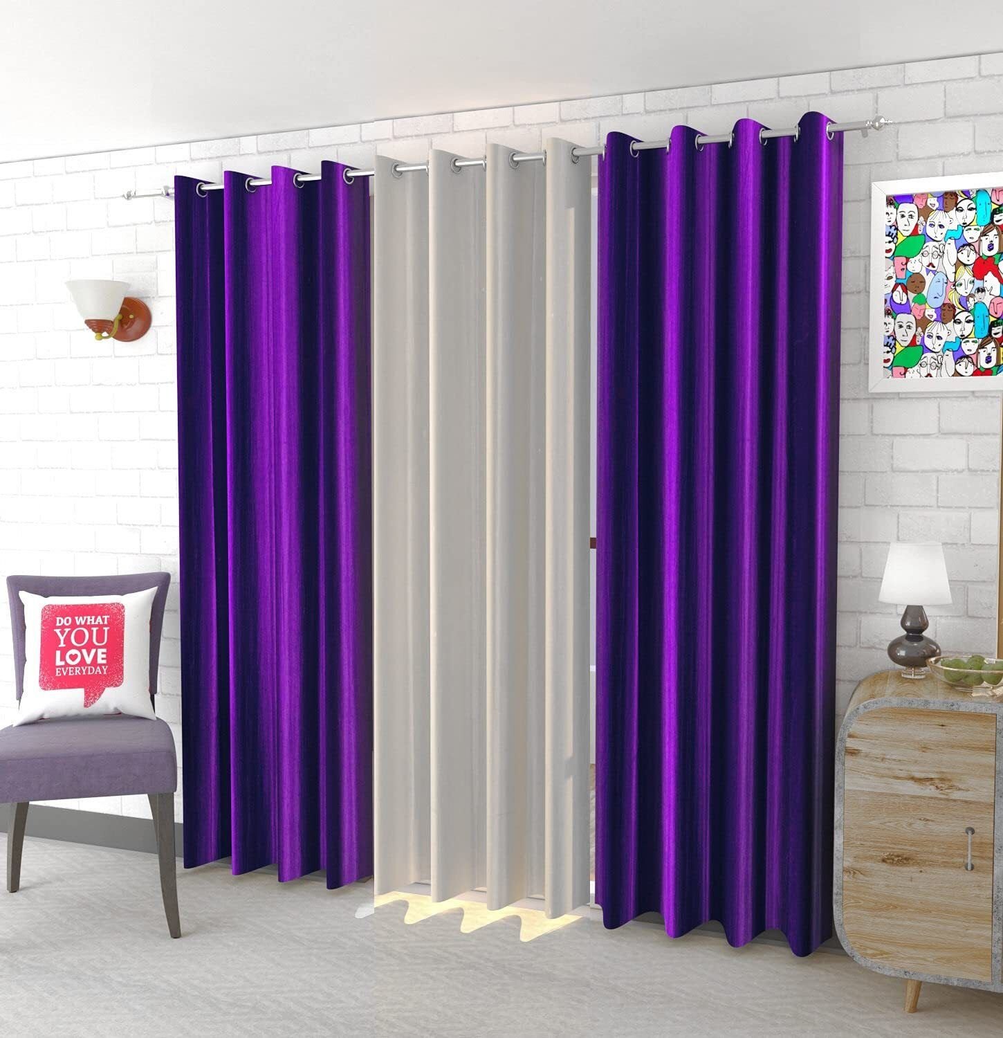 Featuring a sophisticated purple and white color combination, this curtain set brings a perfect balance of boldness and subtle elegance to your room. The rich purple panels add depth and luxury, while the white center panel creates a clean and refreshing contrast, making your space look brighter and more stylish.