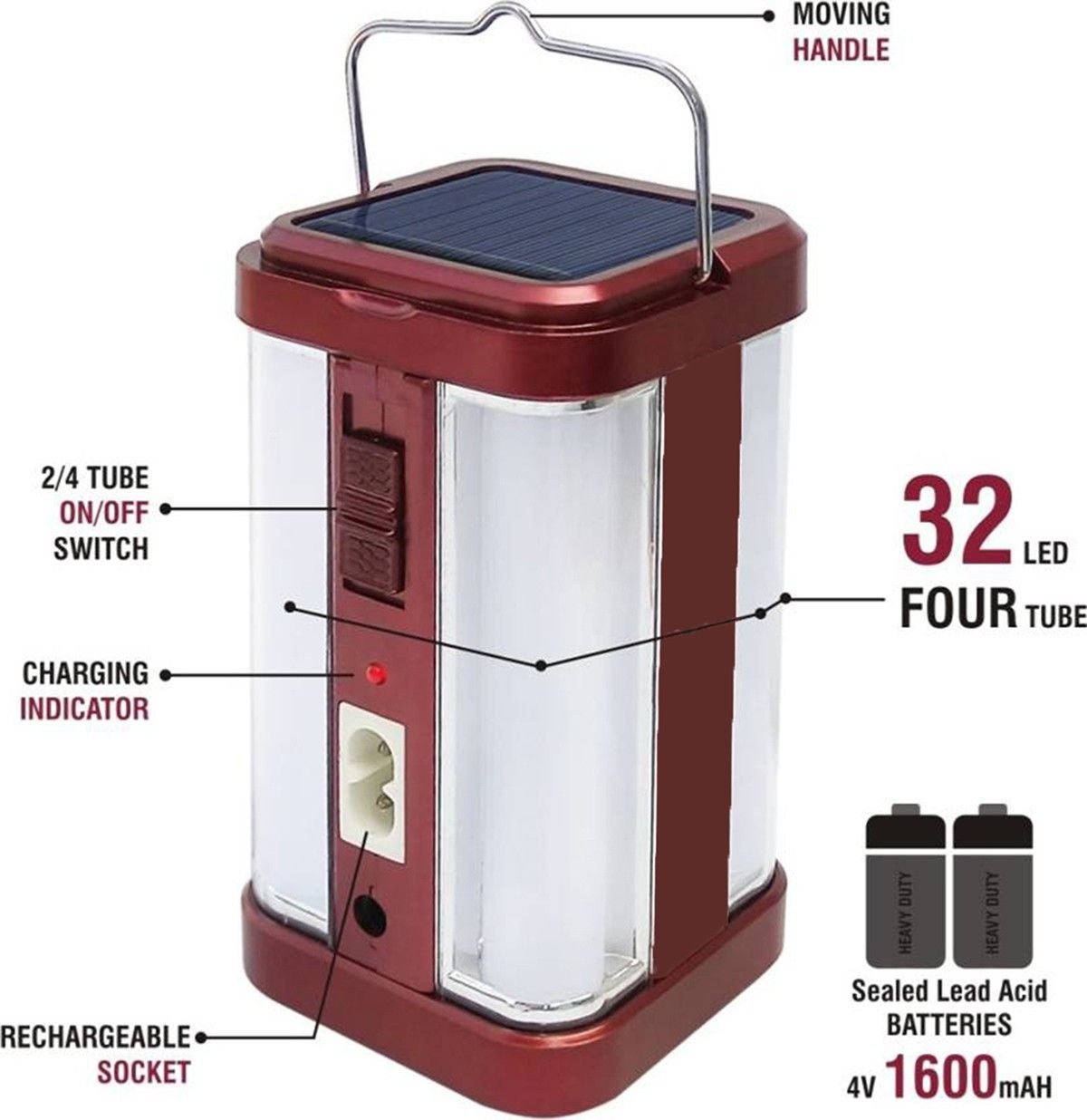 IDOLESHOP 4 Tube 360° Extra Bright Solar & Electric Rechargeable Lantern – 7 hrs Backup (Maroon)