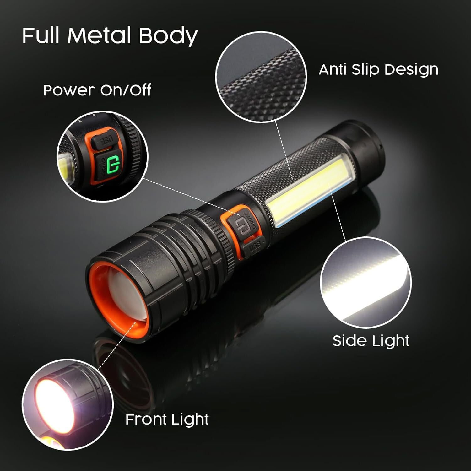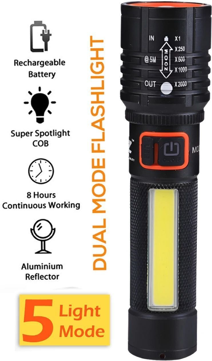 Experience powerful illumination with the IDOLESHOP 50W Zoomable LED Metal Flashlight, designed for performance, durability, and versatility. Built with a strong full metal body, this torch delivers exceptional brightness using a high-intensity Cree LED along with an integrated COB side light for wider coverage.
