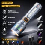 IDOLESHOP 50W Zoomable Metal LED Torch – 5 Modes Rechargeable Flashlight (Silver, 14 cm)