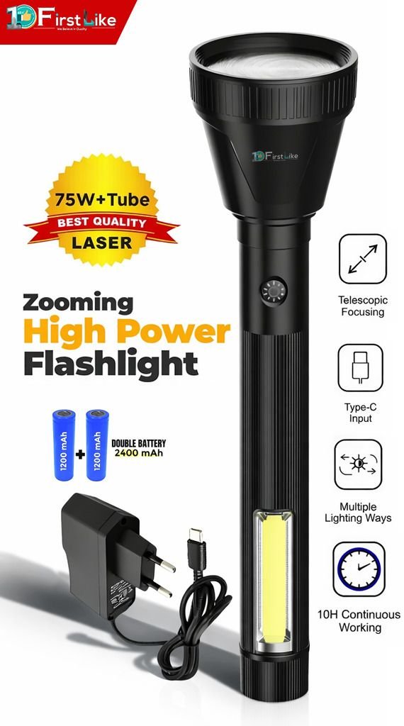 Light up any situation with the powerful and versatile IDOLESHOP Zoomable Torch Light. Designed for long-range visibility and emergency use, this high-performance flashlight combines a strong 75W laser beam with a practical side COB light, making it perfect for both focused and wide-area lighting.