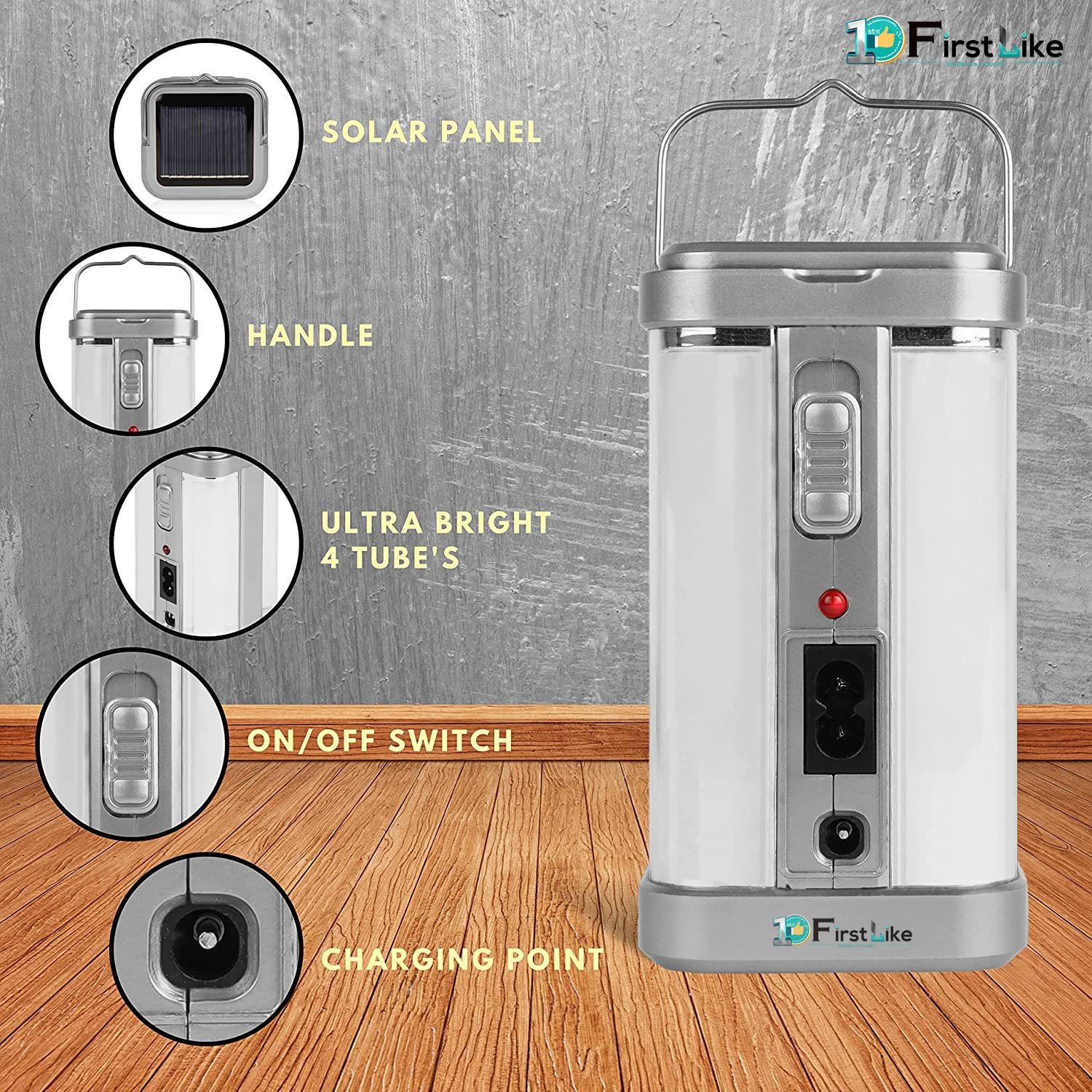 IDOLESHOP Electric & Solar Rechargeable Emergency Lantern – Powerful 4 Tube Light (Silver)