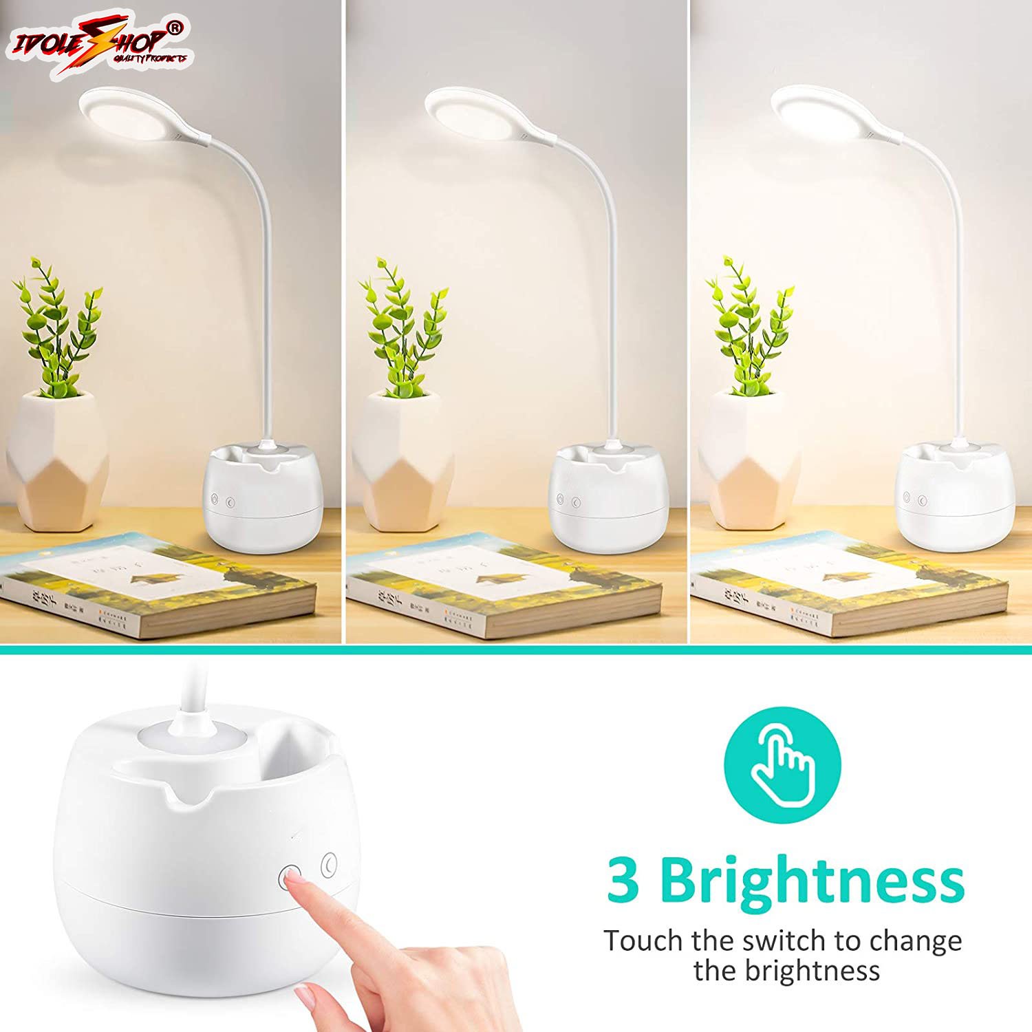 IDOLESHOP Flexible Rechargeable Desk Lamp with 3 Shade Touch Control, Mobile Holder, Night Light, 2000mAh Battery & Type-C Charging