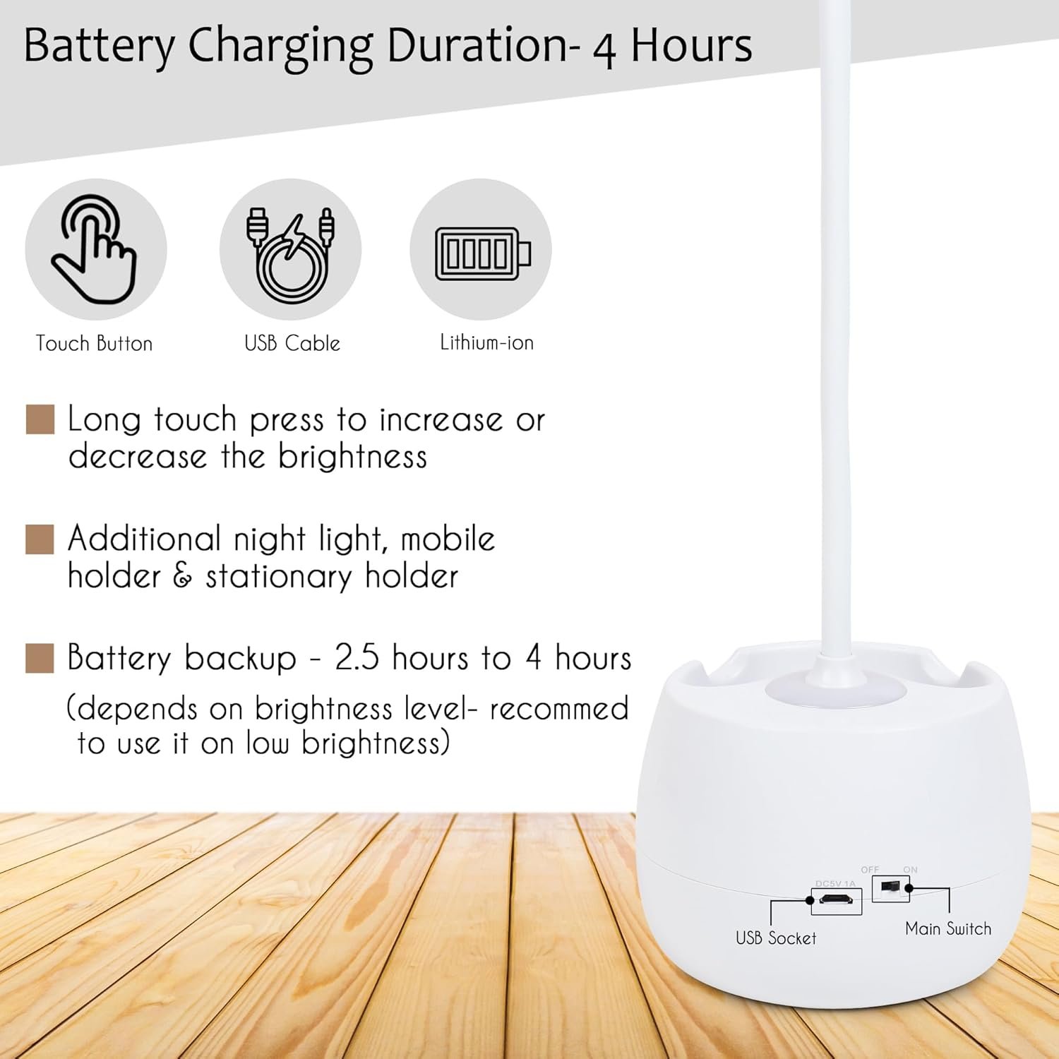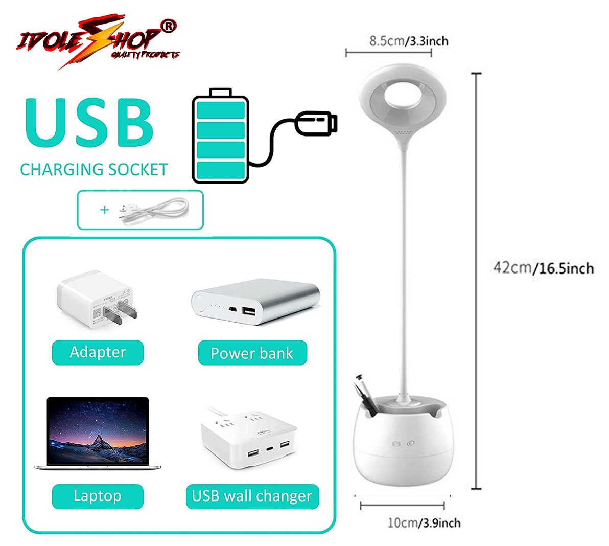 Made from durable ABS plastic with a smooth glossy white finish. Stylish, long-lasting desk lamp that enhances home, office, and study table decor.