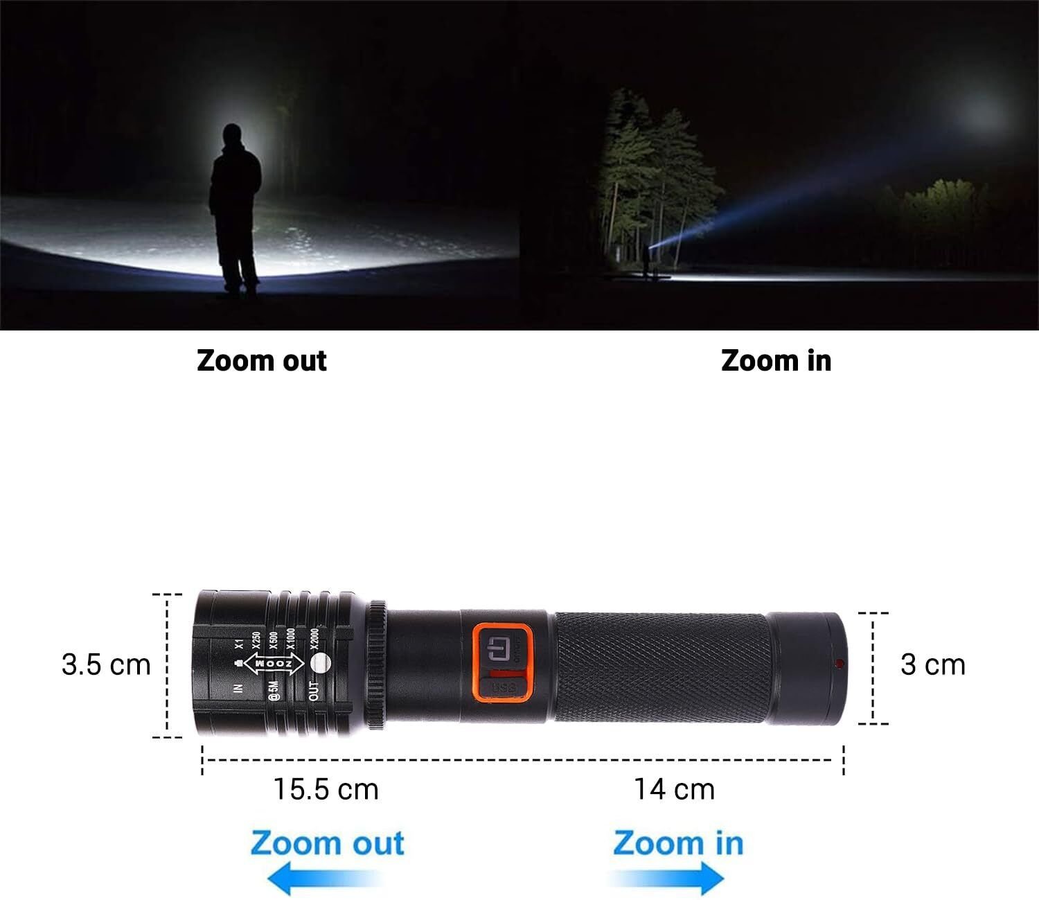 - Zoomable LED focus (spotlight & floodlight)