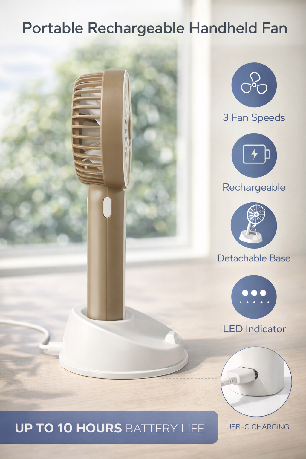 - Use as a handheld fan or place it on a surface for hands-free cooling.