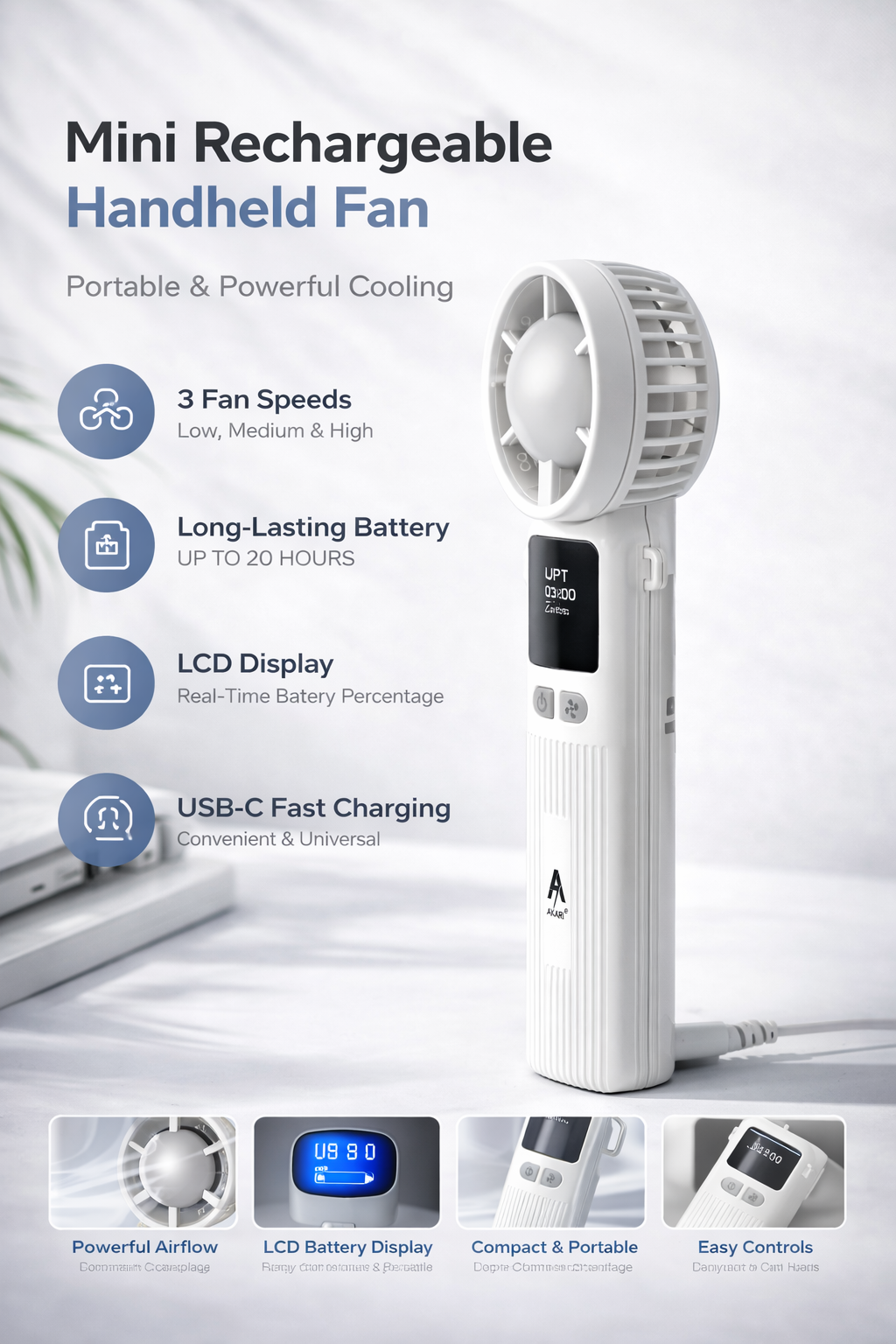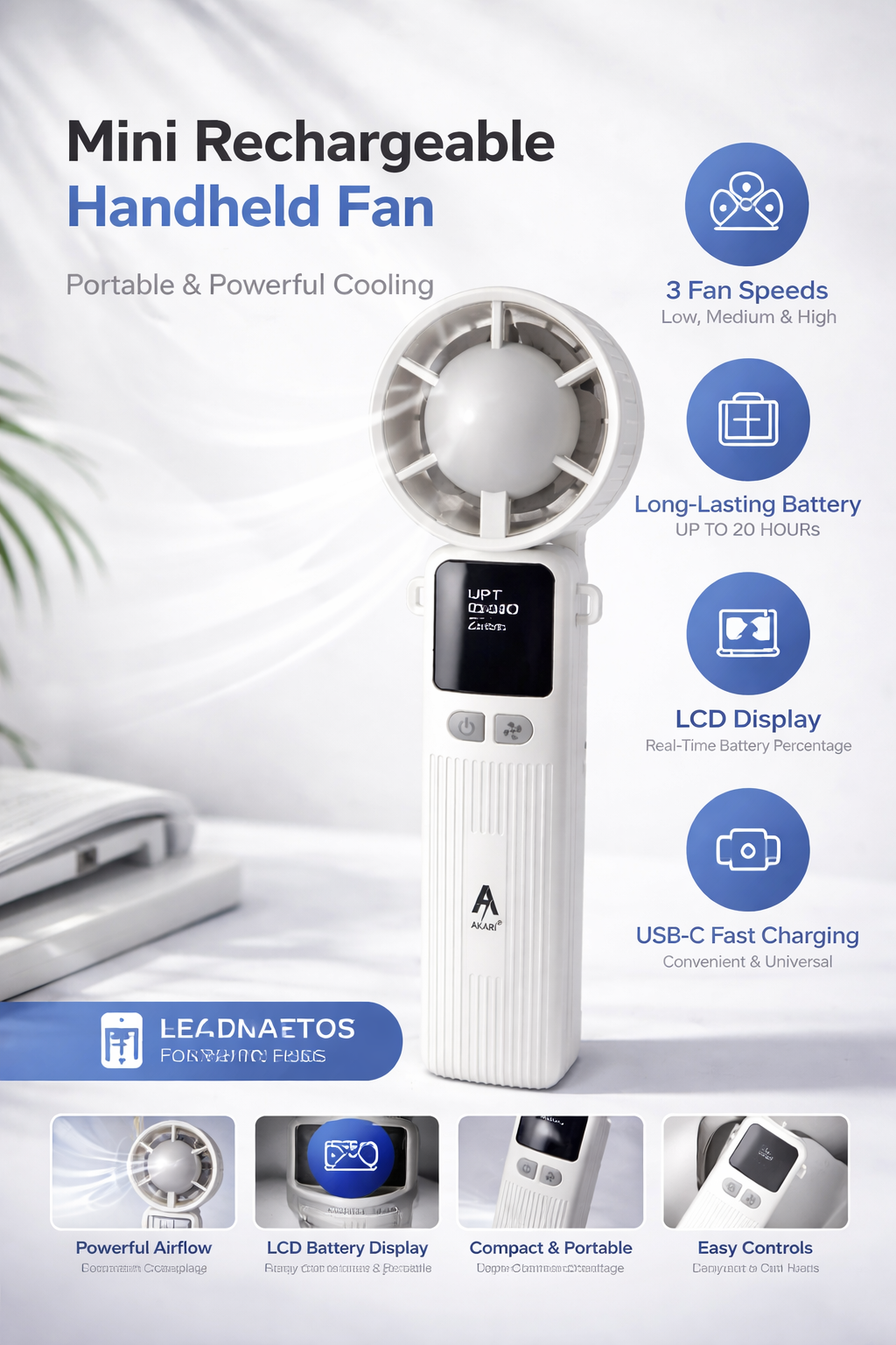 Stay cool anytime, anywhere with the IDOLESHOP Mini Rechargeable Fan, designed for powerful airflow in a compact and stylish body. Perfect for daily use, travel, office, or outdoor activities, this fan combines performance with convenience.