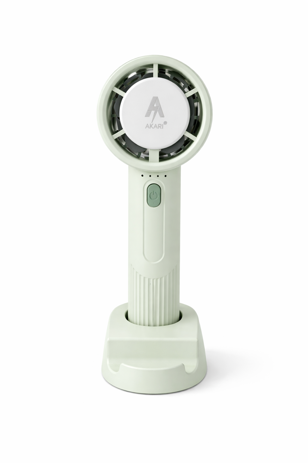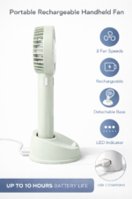 Use it as a handheld fan or place it on a desk; base also works as a mobile holder for added convenience.