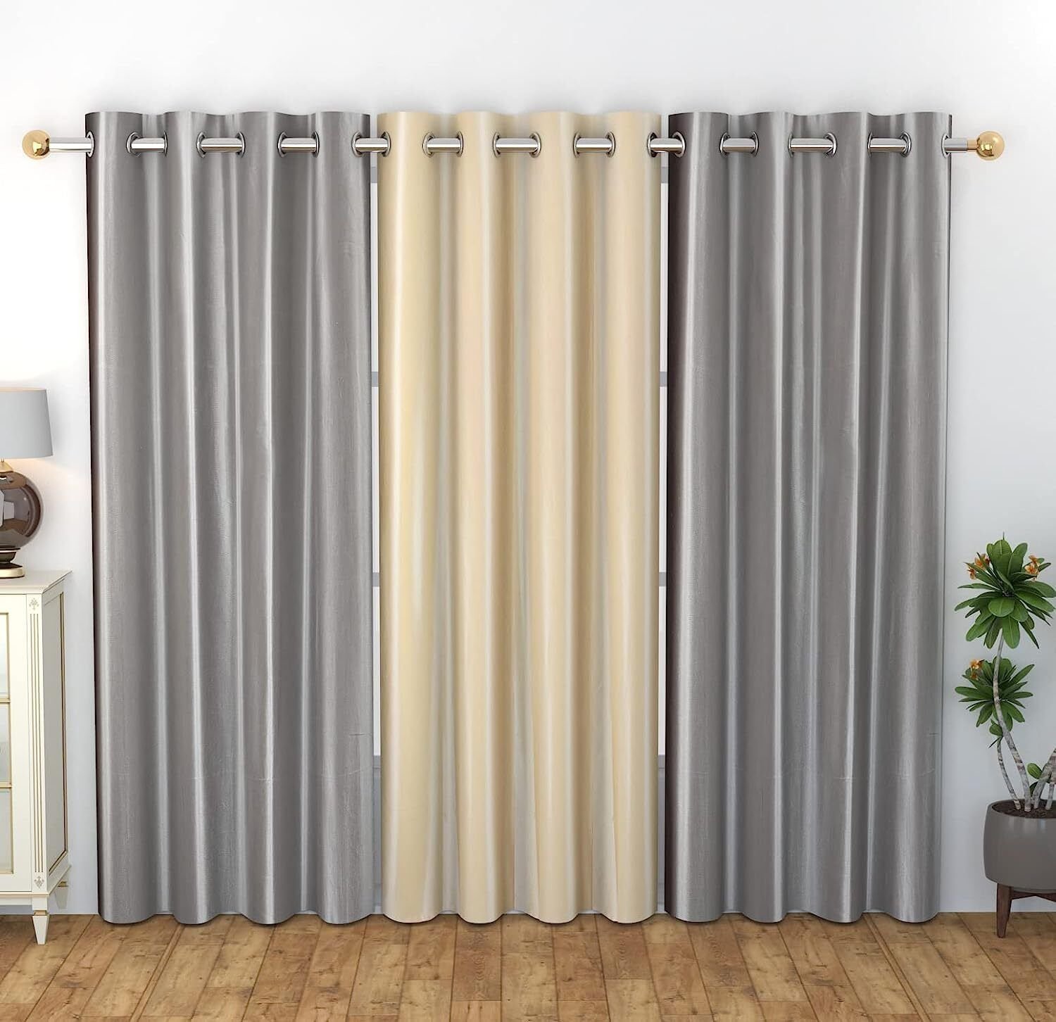 IDOLESHOP 9 ft polyester room darkening curtains in elegant silver & beige color. Stylish, durable, and perfect for long doors. Pack of 3 with easy eyelet design.