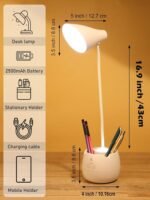 A sleek desk lamp with touch on/off control and flexible neck. Features eye-care LED light, rechargeable battery, and built-in pen & mobile holder—perfect for study and office use.