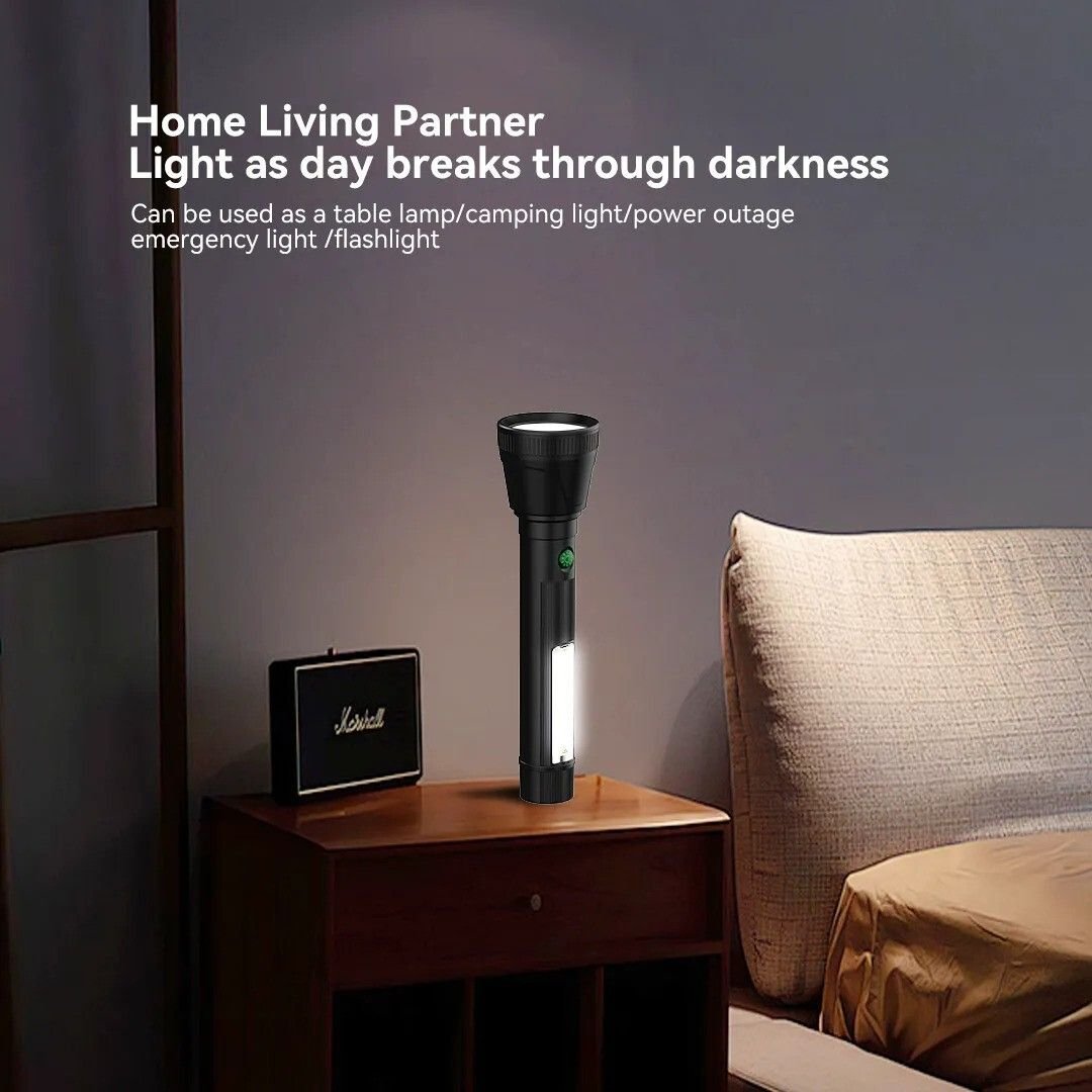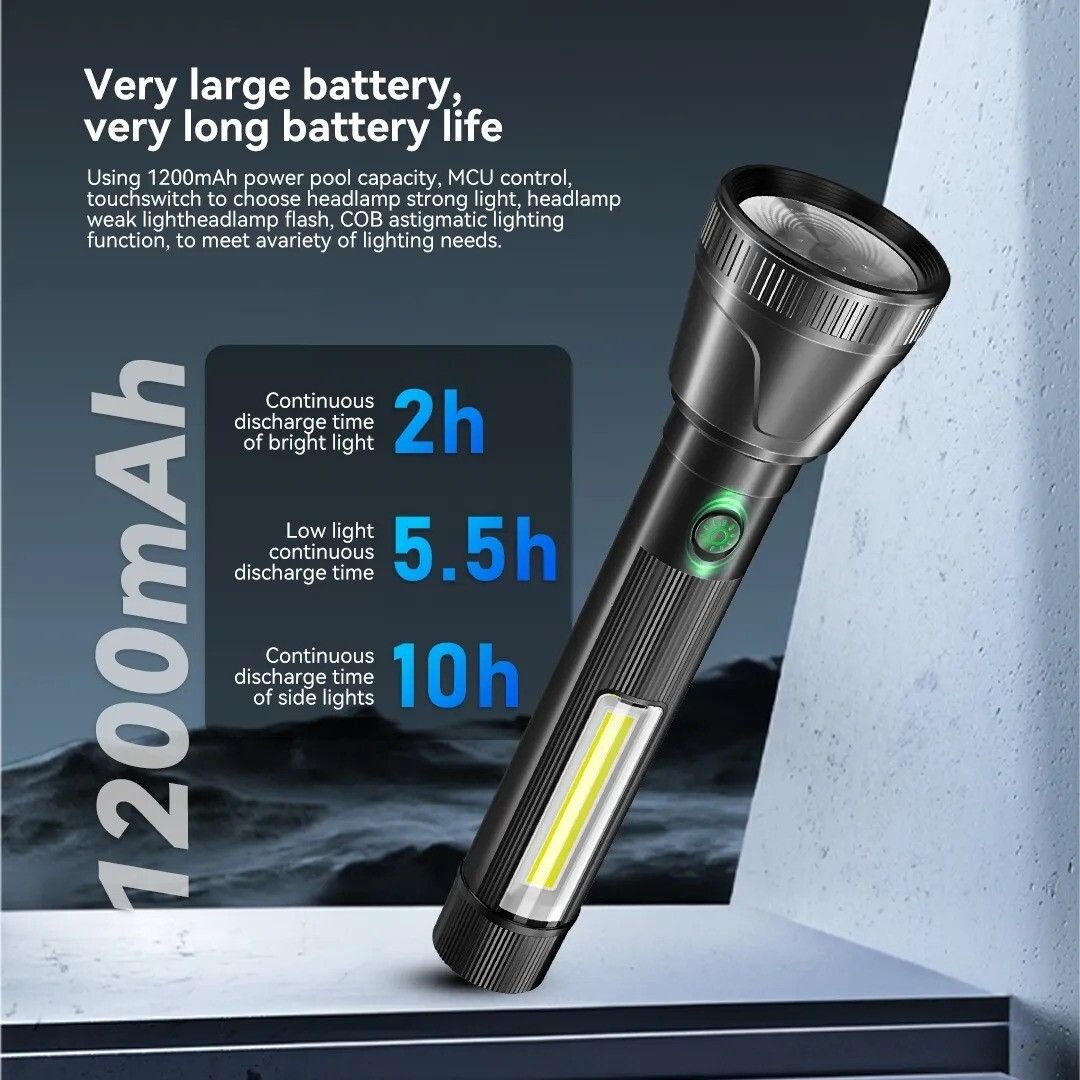 Equipped with 3 lighting modes (High, Low, and Flash), this torch adapts to different situations—whether you need maximum brightness, energy-saving light, or an emergency signal. The built-in side COB light provides wide-angle illumination, ideal for room lighting, repairs, or power outages.